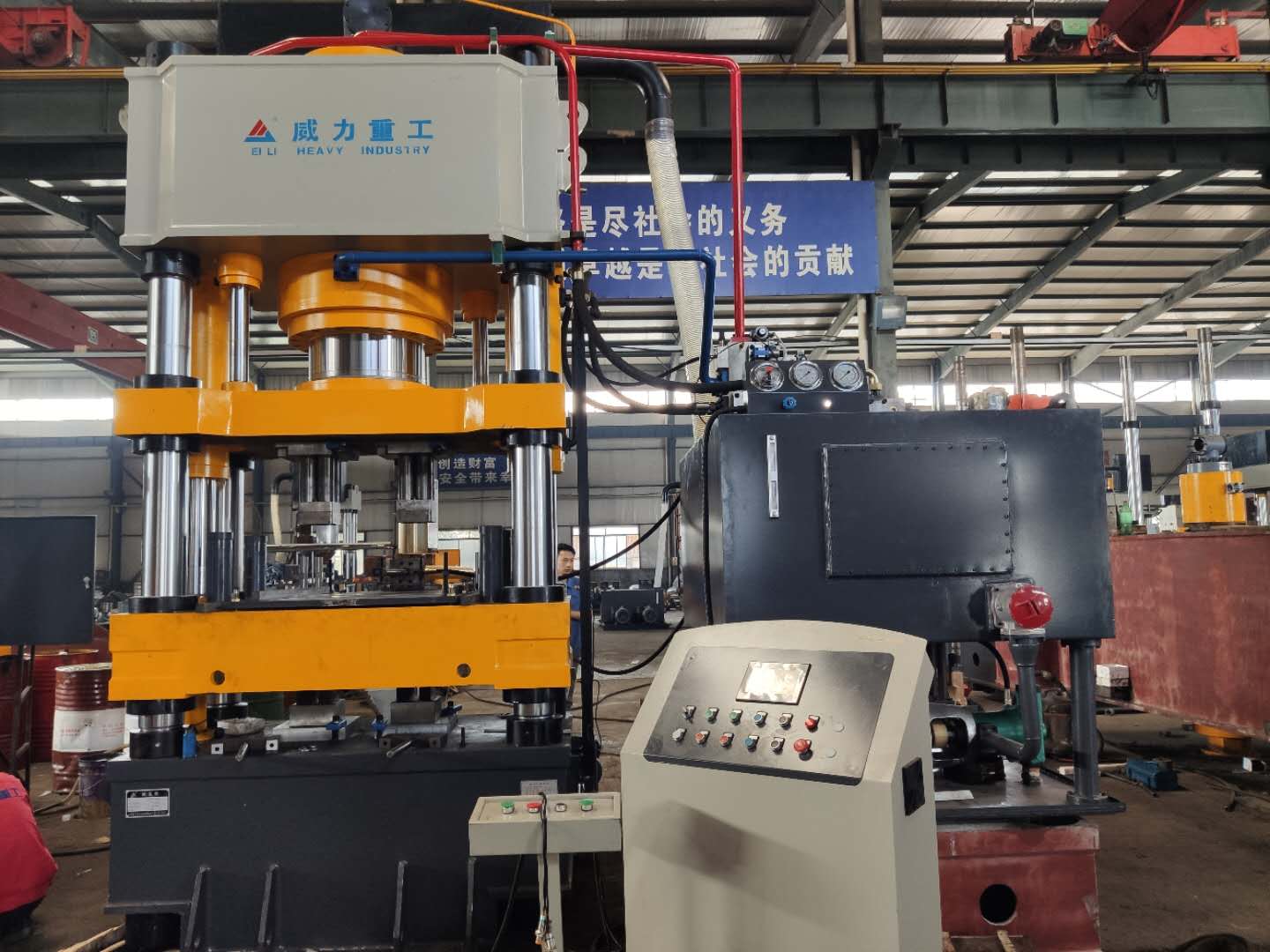 四梁四柱粉末壓塊液壓機采用四柱式框架結構,由上橫梁、下橫梁、四個立柱和工作臺組成。設備整體結構緊湊、穩定,具有良好的剛性和承載能力。上橫梁設有液壓缸,通過傳動機構驅動滑塊進行上下往復運動,實現對粉末的壓制成型。工作臺設有頂出機構,方便脫模和取料。此外,設備還配備了電氣控制系統和安全保護裝置,確保設備的安全可靠運行。